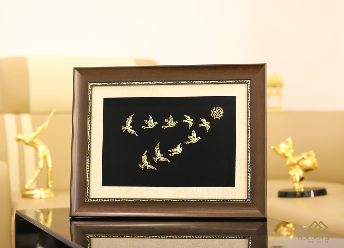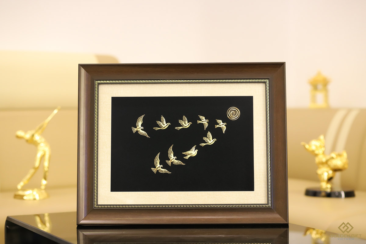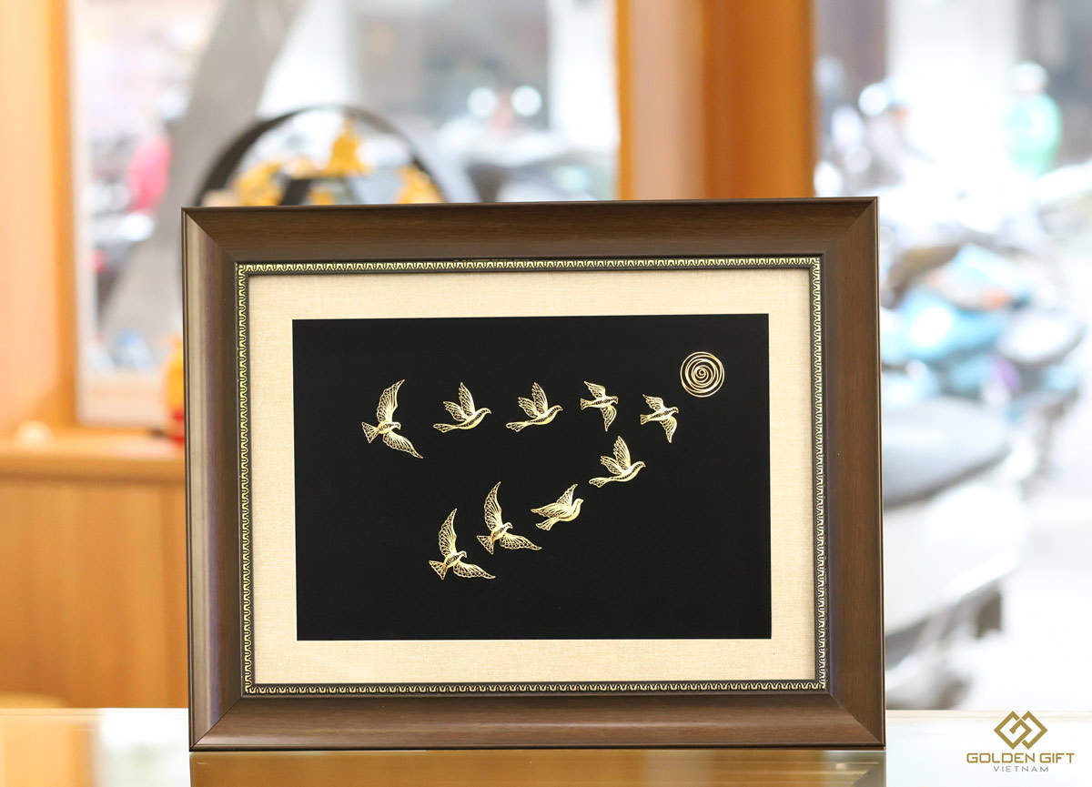 Từ bàn tay tài hoa của những người thợ lành nghề, trải qua hơn 10 công đoạn mạ vàng, những chú chim mặt trời hiện lên trực rỡ, lấp lánh với sắc vàng sang trọng. Sự tinh tế trong mỗi đường nét, sắp xếp khiến bức tranh càng thêm nổi bật. Hiện lên giữa nền nhung đen bí ẩn là 9 cánh chim sải cánh hướng về sự thành công và lý tưởng. Ánh dương soi sáng là động lực, cũng là mục tiêu để ngưỡng vọng cho mọi sự phấn đấu thêm ý nghĩa.