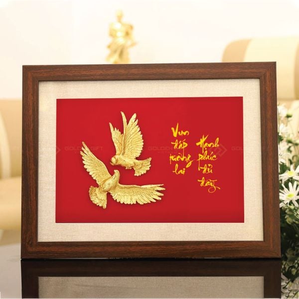 Tranh đôi chim bồ câu mạ vàng là tuyệt tác quà tặng cao cấp, biểu tượng cho tình yêu thủy chung, hòa bình và hạnh phúc viên mãn. Được chế tác tinh xảo, mạ vàng 24K sang trọng, bức tranh mang thông điệp "Vun đắp tương lai - Hạnh phúc đủ đầy", là lựa chọn hoàn hảo cho đám cưới, kỷ niệm ngày cưới, tân gia, tôn vinh tình nghĩa vững bền.